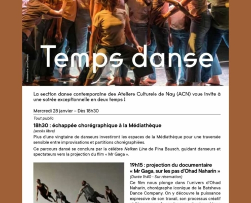 -> événements, Danse contemporaineLa section danse contemporaine des ACN s'invite à l'espace culturel du Pays de Nay pour vous proposer une échappée chorégraphique au cœur de la médiathèque, mercredi 28/01 dès 18h30. Pour ceux qui le souhaitent, la soirée se poursuivra…
